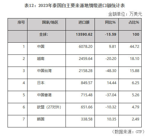 2023年,泰國綢緞進(jìn)口額為1.36億美元,同比下降15.59%。