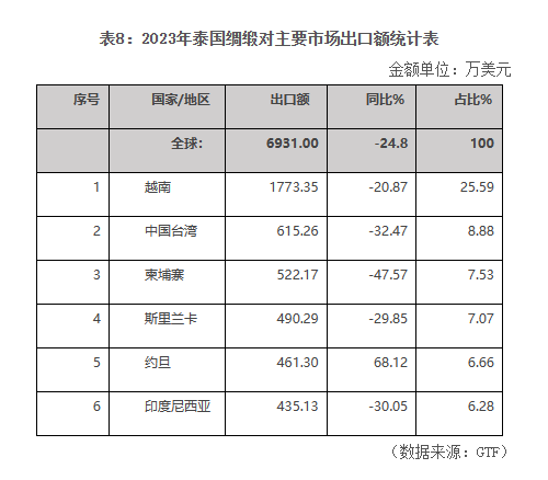 2023年,泰國綢緞出口額為0.69億美元,同比下降24.80%。