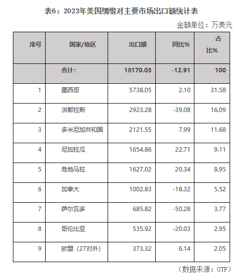 在主要市場中,對墨西哥、多米尼加共和國、尼加拉瓜和危地馬拉出口均呈現(xiàn)不同程度的增長,但難挽美國綢緞出口頹勢,主要原因是對第二大市場洪都拉斯的出口降幅近40%(詳見表6)。