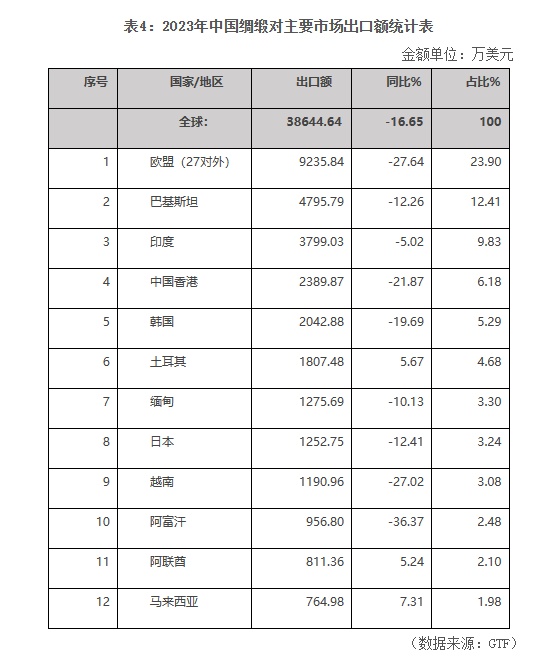2023年,中國綢緞出口結(jié)束了連續(xù)2年的增長,出口額為3.86億美元,同比下滑16.66%。