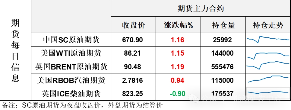 【1】WTI主力原油期貨收漲0.98美元,漲幅1.15%,報(bào)86.21美元/桶;布倫特主力原油期貨收漲1.06美元,漲幅1.19%,報(bào)90.48美元/桶;INE原油期貨收漲1.16%,報(bào)670.9元。