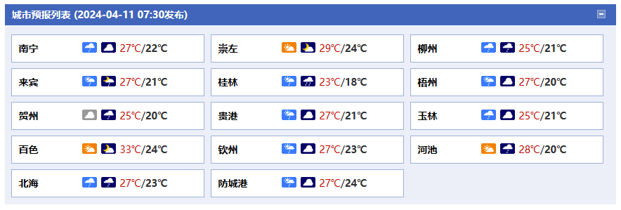 11日晚上到12日白天,桂東北有中雨、局地大雨到暴雨并伴有短時(shí)雷暴大風(fēng)等強(qiáng)對(duì)流天氣,其它地區(qū)陰天到多云有陣雨或雷雨。