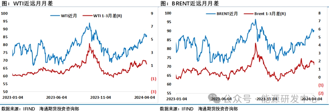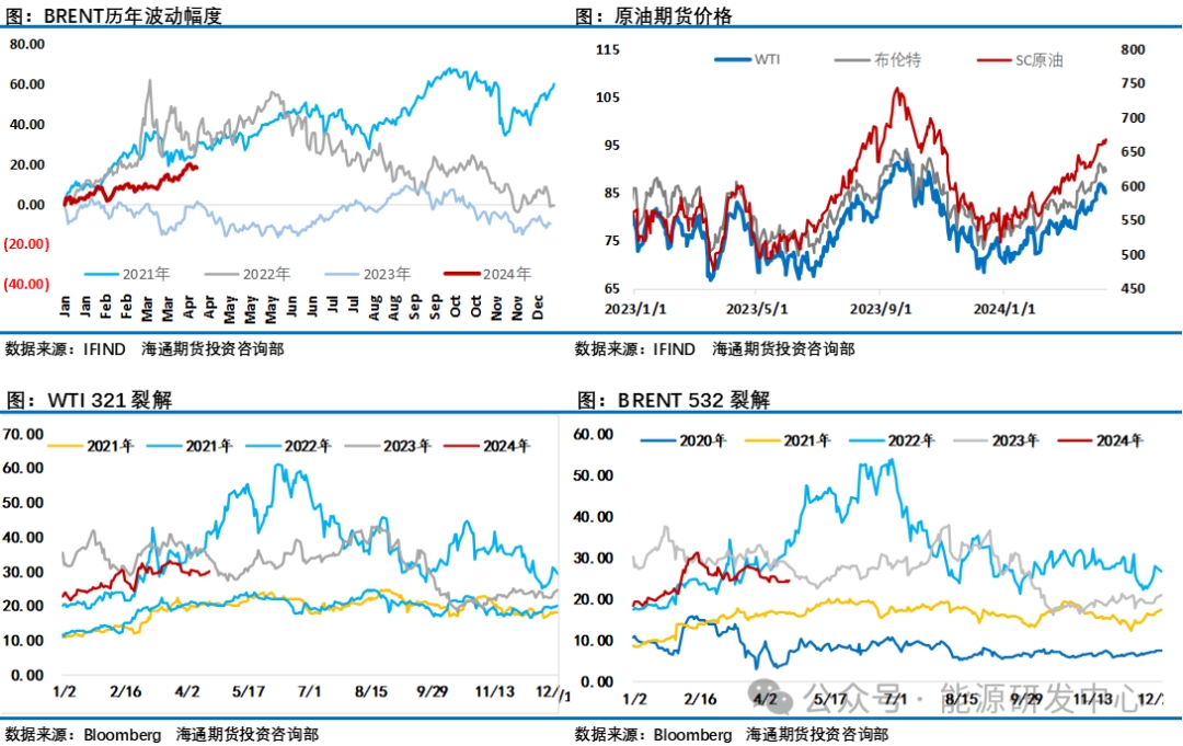 總體來看4月份三大機(jī)構(gòu)月報(bào)沒有像3月份那樣給油價(jià)帶來明顯的推漲動(dòng)力,IEA和EIA對(duì)需求的下調(diào)有為油市降溫的意圖,但并沒有引起市場(chǎng)的重視,沒有給油價(jià)帶來明顯的負(fù)面沖擊。從周度數(shù)據(jù)來看美國原油加工量正在回升階段,而最近一個(gè)月中國市場(chǎng)進(jìn)入傳統(tǒng)的地方煉廠檢修季,國內(nèi)原油加工利潤處于低位也推動(dòng)了煉廠檢修意愿,獨(dú)立煉廠開工率刷新了一年半來的低點(diǎn)?,F(xiàn)階段需求端給油價(jià)帶來的影響相對(duì)有限。相對(duì)于機(jī)構(gòu)的下調(diào)需求預(yù)期來講,投資者注意力仍然集中在了中東地緣風(fēng)險(xiǎn)層面帶來的供應(yīng)中斷風(fēng)險(xiǎn),過去一周圍繞以色列和伊朗直接的沖突一波三折,這也讓投資者對(duì)油價(jià)判斷搖擺不定,地緣溢價(jià)整體維持在高位。