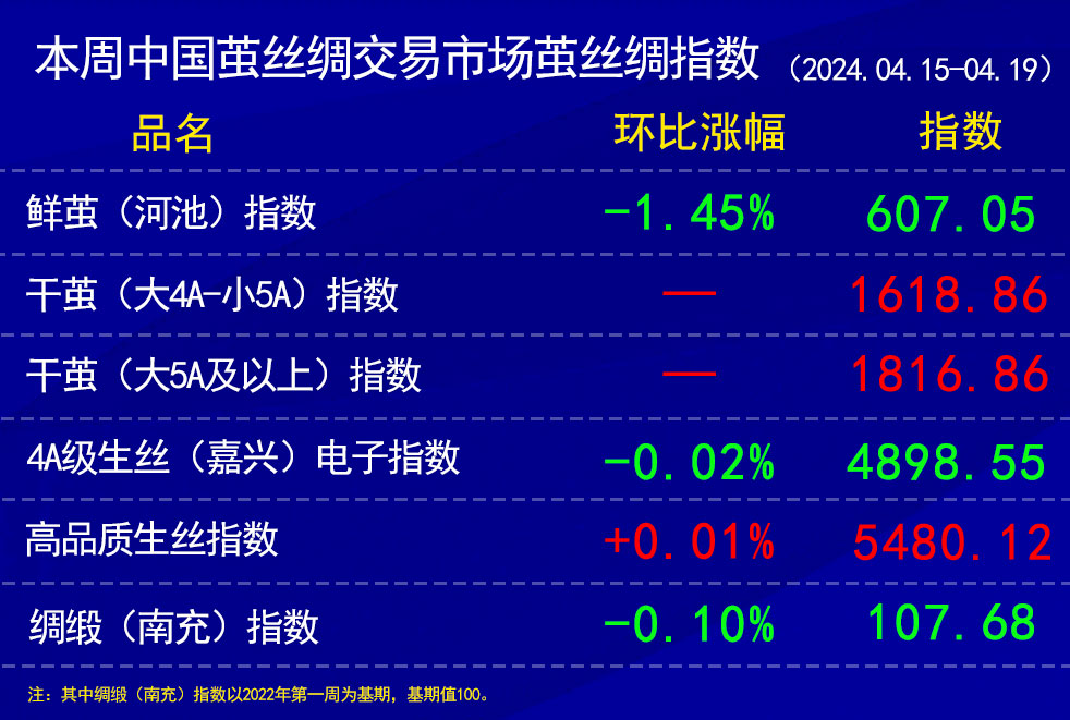 鮮繭指數(shù)上,本周廣西宜州等周邊地區(qū)的春繭上市面逐步擴(kuò)大,今日河池德勝片區(qū)60-64元,環(huán)江的首批春繭也開始上市,價(jià)格多在62-65元。從協(xié)作單位上報(bào)數(shù)據(jù)來看,本周廣西首批春繭的質(zhì)量表現(xiàn)正常。隨著上市面的擴(kuò)大,本周鮮繭指數(shù)環(huán)比上周下跌1.45%。本周鮮繭指數(shù)采樣點(diǎn)為廣東(少數(shù))和廣西(多數(shù))。