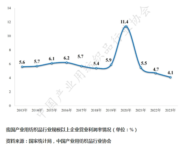 2023年,產(chǎn)業(yè)用紡織品行業(yè)的經(jīng)濟(jì)運(yùn)行呈現(xiàn)前降后升態(tài)勢(shì)。根據(jù)國家統(tǒng)計(jì)局?jǐn)?shù)據(jù),2023年產(chǎn)業(yè)用紡織品行業(yè)規(guī)模以上企業(yè)(非全口徑)的營業(yè)收入與利潤總額同比下降5.8%和19.1%,降幅分別較上半年收窄1.8個(gè)百分點(diǎn)和22.4個(gè)百分點(diǎn),特別是進(jìn)入12月后主要經(jīng)濟(jì)指標(biāo)出現(xiàn)了較大幅度的反彈??傮w來看,行業(yè)企業(yè)的盈利能力普遍承壓,盡管4.1%的營業(yè)利潤率較上半年提升1.2個(gè)百分點(diǎn),但仍處于近十年來的最低點(diǎn)。