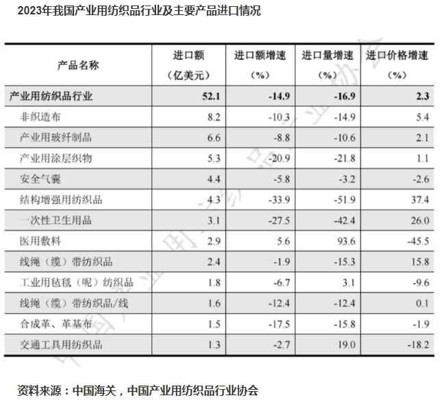 根據(jù)中國海關(guān)數(shù)據(jù),2023年,我國產(chǎn)業(yè)用紡織品行業(yè)的進(jìn)口額(海關(guān)8位HS編碼統(tǒng)計(jì)數(shù)據(jù))為52.1億美元,同比下降14.9%。