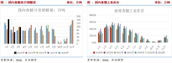國內(nèi)存在以下幾個(gè)方面的變化。一是雖然4月中國農(nóng)產(chǎn)品供需形勢(shì)分析仍維持國產(chǎn)糖產(chǎn)量995萬噸預(yù)估,但廣西產(chǎn)量由預(yù)期的不足600萬噸升至610萬噸附近,主產(chǎn)區(qū)的增產(chǎn)幅度仍較大。2024/2025榨季國內(nèi)白糖(6207, 2.00, 0.03%)存在較強(qiáng)的豐產(chǎn)預(yù)期,這源自于政策扶持力度大,國內(nèi)糖料種植面積可能保持穩(wěn)定或小幅增加,同時(shí)厄爾尼諾現(xiàn)象將在今年夏天結(jié)束,將有利于甘蔗生長。因此,未來國內(nèi)糖產(chǎn)量有望繼續(xù)增加,長期施壓國內(nèi)糖價(jià)。二是3月國內(nèi)產(chǎn)銷數(shù)據(jù)不及預(yù)期,引導(dǎo)工業(yè)庫存由同比降低轉(zhuǎn)為同比增加。具體來看,截至3月底,累計(jì)產(chǎn)糖957萬噸,比上年同期增加86萬噸;累計(jì)銷糖473萬噸,比上年同期增加36萬噸;累計(jì)銷糖率49.5%,比上年同期減少0.7個(gè)百分點(diǎn)。3月單月銷糖95.6萬噸,略低于去年同期101萬噸與近年平均值95.8萬噸基本持平。當(dāng)月食糖工業(yè)庫存483.86萬噸,同比增加49.53萬噸,本榨季首次由同比降低轉(zhuǎn)為增加。不過,庫存整體處于近年偏低位置。
