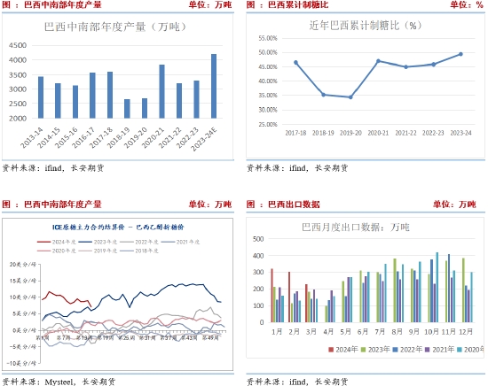 2023/2024季截至4月中旬,泰國糖廠全部收榨,累計(jì)產(chǎn)糖877.26萬噸,同比下降20.25%,雖然大幅減產(chǎn),但減產(chǎn)幅度仍不及預(yù)期。與此同時(shí),印度共產(chǎn)糖3109萬噸,同比下降0.46%,產(chǎn)量基本與去年持平,減產(chǎn)逐步被證偽。此外,該榨季巴西產(chǎn)量達(dá)到4242.5萬噸,較去年同期的3375萬噸增加了867.5萬噸,同比增幅達(dá)25.70%,出口同比大幅增加,保證了全球食糖供應(yīng)。不過隨著各主產(chǎn)國2023/2024榨季基本結(jié)束,市場視線轉(zhuǎn)移至新榨季。
