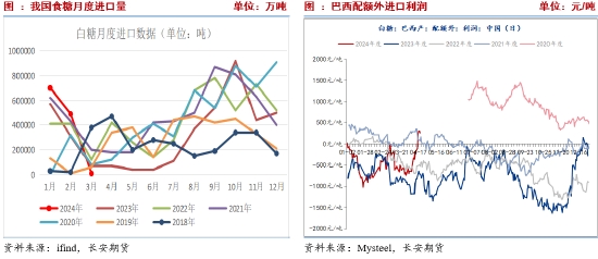 三是進(jìn)口增加預(yù)期強(qiáng)烈。2024年3月我國進(jìn)口1萬噸,同比下降5.63萬噸,降幅84.91%;2023/2024榨季截至3月,我國進(jìn)口食糖306.24萬噸,同比增加34.41萬噸,增幅12.66%。3月我國進(jìn)口糖漿和預(yù)拌粉15.74萬噸,同比減少0.49萬噸,但2023/24榨季截至3月,我國共進(jìn)口74.1萬噸,同比增加24.67萬噸,增幅49.89%。近期原糖下跌幅度較大,引導(dǎo)配額外進(jìn)口成本回歸并修復(fù)內(nèi)外價(jià)差,國內(nèi)進(jìn)口窗口逐漸打開,后期食糖進(jìn)口量可能維持高位。其中7月合約自22.50美分附近跌至19美分上方,跌幅約6%。當(dāng)下巴西產(chǎn)糖配額外加工成本降至6669元/噸,進(jìn)口利潤由負(fù)轉(zhuǎn)正,不斷推升進(jìn)口預(yù)期。不過海關(guān)發(fā)布加強(qiáng)保稅區(qū)高糖度糖漿預(yù)拌粉管理公告,暗示保稅區(qū)規(guī)避配額的現(xiàn)象將減少,后續(xù)進(jìn)口糖生產(chǎn)糖漿或糖粉,內(nèi)銷需要補(bǔ)充進(jìn)口稅,有利于提升糖價(jià)。短期內(nèi)從3月進(jìn)口來看已經(jīng)起到一部分作用。長期來看,對(duì)食糖進(jìn)口采取嚴(yán)格管理信號(hào),關(guān)注政策發(fā)布后執(zhí)行情況。