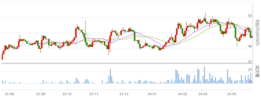 今日(2024年04月23日,周二)中國繭絲綢交易市場生絲指數(shù)下跌0.28%收于4856.39點(diǎn)。B絲(商檢4A級生絲):240425合約下跌0.36萬元報收于48.00萬元;240925合約上漲0.09萬元報收于48.78萬元;250325合約下跌0.03萬元報收于49.08萬元。