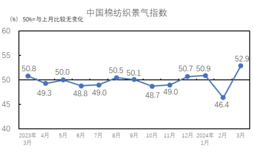 說明:中國棉紡織行業(yè)景氣指數(shù)采集自全國近500家次棉紡織廠,參考國家制造業(yè)PMI等指數(shù)制定方式,通過對(duì)多個(gè)主要指標(biāo)加權(quán)計(jì)算得出,當(dāng)指數(shù)高于50,表示棉紡織行業(yè)本月景氣程度好于上月,低于50則表示本月景氣程度不及上月。