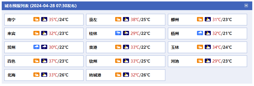 南寧市:今天白天到晚上,多云到晴、局地有陣雨或雷雨,東南風(fēng)1~2級(jí),最高氣溫35℃,最低氣溫24℃。