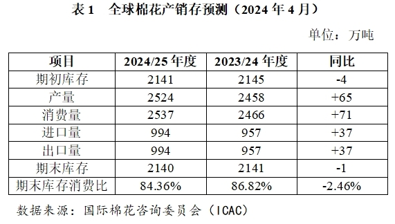預計2024/25年全球棉花消費略有增長。從產業(yè)鏈下游來看,1-3月巴基斯坦紡織品出口額41.7億美元,同比增長10.6%;越南紡織品出口額47.57億美元,同比增長7.9%。盡管全球紡織市場小幅改善,但去庫尚未完成前國際品牌增加訂單仍較謹慎,亞洲地區(qū)紡織品服裝出口較往年同期水平仍有差距。據國際棉花咨詢委員會(ICAC)預測,2024/25年度全球棉花產量2524萬噸,同比增長2.7%,其中美棉產量增幅最大,產量同比增長32%至348萬噸,高于此前其他機構預測的338萬噸;全球棉花消費量2537萬噸,同比增加2.9%;全球庫存消費比84.36%,同比下降2.46個百分點。