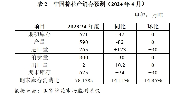 棉花產需平衡上調年度進口量??紤]到棉花進口量持續(xù)增加,本期上調2023/24年度棉花進口量30萬噸至265萬噸;同步上調棉花期末庫存30萬噸至625萬噸;庫存消費比上調4.85個百分點至78.13%,本年度棉花產需形勢進一步寬松。
