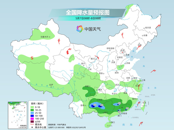 昨天,我國的強降水主要集中在廣西中南部、廣東中西部、海南島中部及貴州中北部、云南東南部等地,部分地區(qū)出現(xiàn)大到暴雨,廣西玉林,廣東肇慶、佛山、清遠,海南白沙,貴州黔南州、畢節(jié)等局地有大暴雨現(xiàn)身。此外,吉林東部、遼寧東北部及新疆伊犁河谷等地出現(xiàn)中雨,局地大雨。