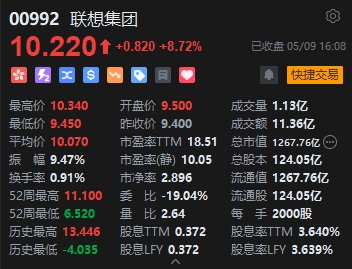 聯(lián)想集團(10.22, 0.82, 8.72%)大漲近9%。消息面上,聯(lián)想此前在創(chuàng)新科技大會正式發(fā)布多款AI PC新產品。據(jù)TechInsights報告顯示,2024Q1聯(lián)想全球筆記本電腦出貨1080萬臺,同比增長12%,高于全市場7%的增速,并且以23%的市場份額領跑。