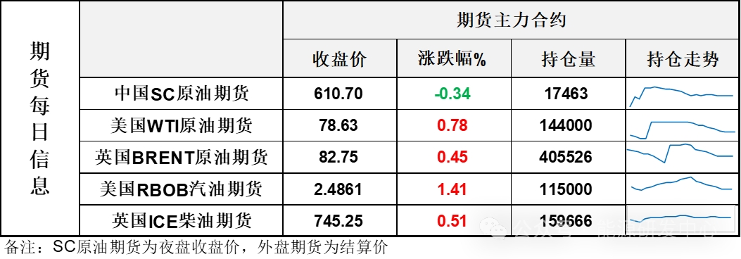 【1】WTI主力原油期貨收漲0.61美元,漲幅0.78%,報78.63美元/桶;布倫特主力原油期貨收漲0.37美元,漲幅0.45%,報82.75美元/桶;INE原油期貨收跌0.34%,報610.7元。