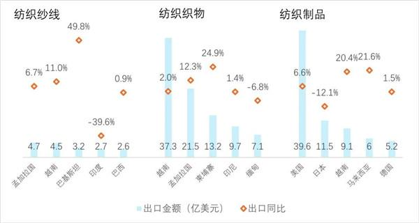 圖3 我國(guó)對(duì)部分主要國(guó)家出口紡織紗線、織物及制品統(tǒng)計(jì)