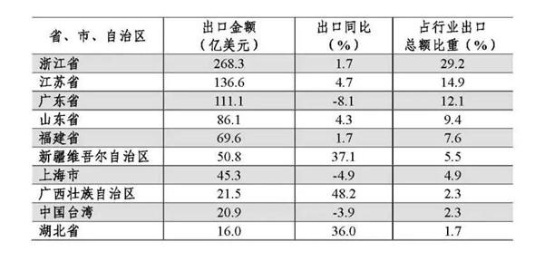 表1 2024年1~4月我國(guó)紡織品服裝出口前十的省市自治區(qū)同統(tǒng)計(jì)