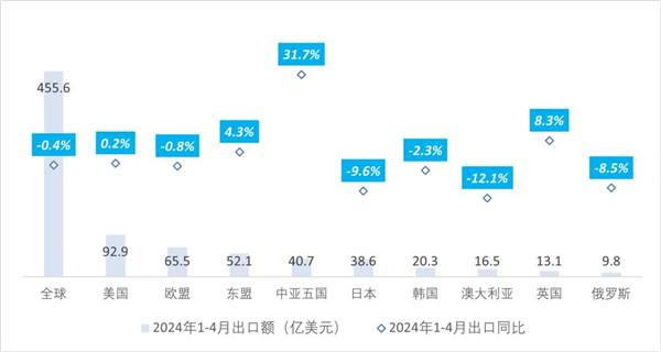 今年1~4月我國(guó)對(duì)全球出口服裝及衣著附件455.6億美元,同比微降0.4%。其中,我國(guó)對(duì)美國(guó)、東盟、英國(guó)等主要市場(chǎng)出口服裝金額保持平穩(wěn)增長(zhǎng),對(duì)中亞五國(guó)服裝出口額同比大幅增長(zhǎng)31.7%,特別是對(duì)哈薩克斯坦出口增速高達(dá)90%。
