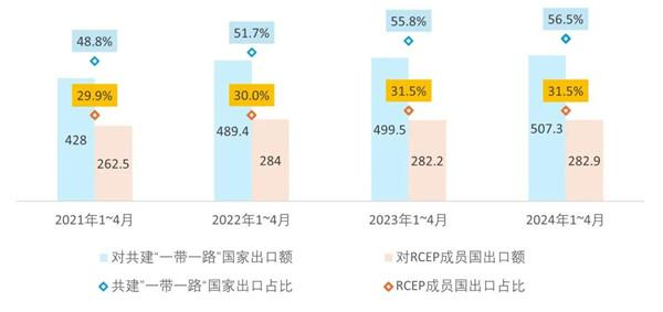 RCEP作為全球規(guī)模最大的自貿(mào)協(xié)定,自生效實(shí)施以來,在降低區(qū)域國(guó)際貿(mào)易成本、活躍商品貿(mào)易、強(qiáng)化產(chǎn)業(yè)鏈供應(yīng)鏈韌性、實(shí)現(xiàn)優(yōu)勢(shì)資源互補(bǔ)等方面發(fā)揮了重要作用。2024年是協(xié)定生效實(shí)施的第三年,今年1~4月,我國(guó)對(duì)RCEP成員國(guó)出口紡織品服裝金額上年同期基本持平,保持了約280億的出口額,較2021年協(xié)議生效前同期增長(zhǎng)7.8%,RCEP國(guó)家占我行業(yè)出口總額比重從2021年的29.9%提升至目前的31.5%。其中,我國(guó)紡織紗線、紡織面料等中間產(chǎn)品對(duì)RCEP成員國(guó)出口額同比增長(zhǎng)約6.6%,好于服裝出口情況。