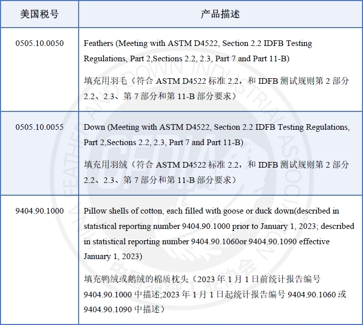 美國貿(mào)易代表辦公室(USTR)當(dāng)?shù)貢r(shí)間2024年5月24日宣布,將429項(xiàng)產(chǎn)品的301關(guān)稅豁免臨時(shí)延長兩周,從2024年5月31日延長至2024年6月14日,同時(shí)將其中部分產(chǎn)品豁免期限延長至2025年5月31日,包括0505.10.0050填充用羽毛、0505.10.0055填充用羽絨和9404.90.1000填充鴨絨或鵝絨的棉質(zhì)枕頭三項(xiàng)產(chǎn)品(具體見下表)。