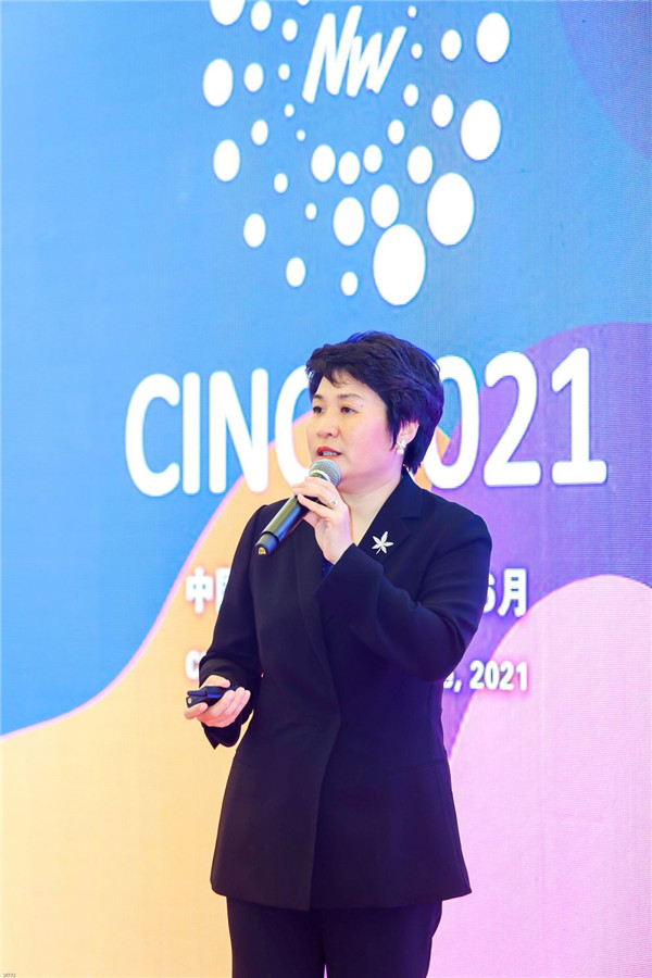 圖為李桂梅在2021年第十屆中國國際非織造布會(huì)議上作主題報(bào)告(2021年6月22日攝)。