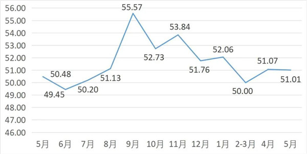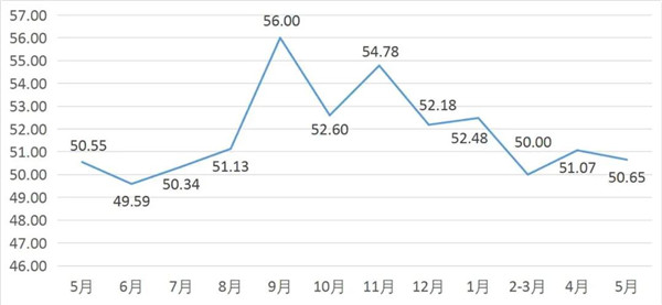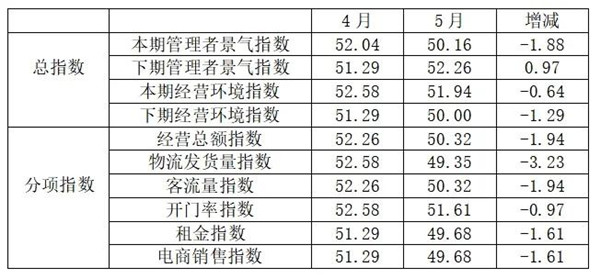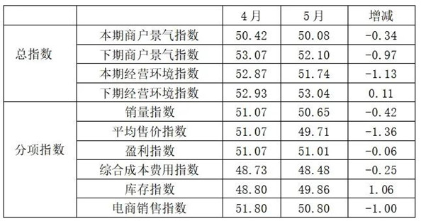 從商戶景氣指數(shù)來看,總指數(shù)中,5月商戶景氣指數(shù)為50.08, 較上月下降0.34個百分點;經(jīng)營環(huán)境指數(shù)為51.74, 較上月下降1.13個百分點。