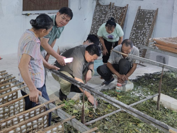 有二十多年養(yǎng)蠶經(jīng)驗的蠶農(nóng)韋大姐表示,今年上半年頻繁的陰雨天氣導(dǎo)致桑園病蟲害增加,桑葉數(shù)量減少、質(zhì)量下降,蠶寶寶出現(xiàn)僵病和膿病的數(shù)量急劇增加,蠶繭質(zhì)量也因此大打折扣。面對大面積的蠶病,即便是經(jīng)驗豐富的她也感到束手無策。劉吉平遂從蠶房的通風(fēng),干燥,降溫,消毒等各個方面對蠶戶的問題進行細致解答,并講解常見蠶病應(yīng)當采用的蠶藥及防治措施。