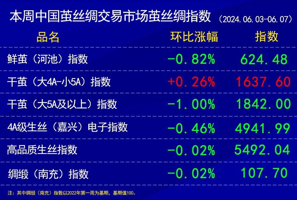 今日(2024年06月07日,周五)中國(guó)繭絲綢交易市場(chǎng)生絲電子指數(shù)下跌0.11%報(bào)于4941.99點(diǎn),本周生絲指數(shù)下跌0.46%。B絲(商檢4A級(jí)生絲):240625合約下跌0.03萬(wàn)元報(bào)收于49.20萬(wàn)元;240925合約下跌0.09萬(wàn)元報(bào)收于49.26萬(wàn)元;250325合約上漲0.09萬(wàn)元報(bào)收于50.04萬(wàn)元。