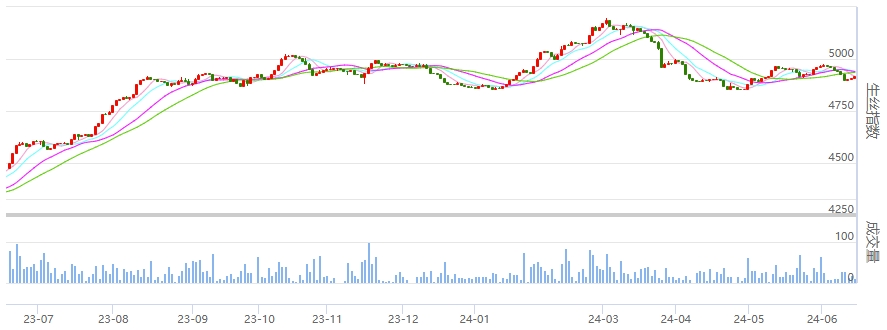 今日(2024年06月17日,周一)中國繭絲綢交易市場生絲電子指數(shù)上漲0.11%報于4916.33點。B絲(商檢4A級生絲):240625合約報平收于49.11萬元;240925合約上漲0.33萬元報收于49.11萬元;250325合約上漲0.24萬元報收于49.89萬元。