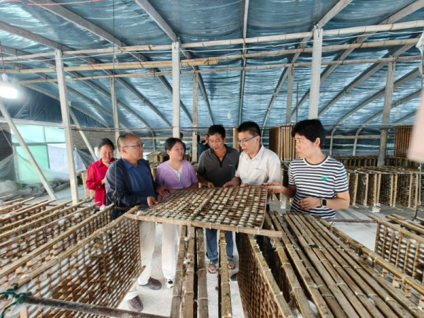 6月13日上午,汪泰初一行赴岳西縣來榜鎮(zhèn)關(guān)河村調(diào)研。岳西縣農(nóng)業(yè)農(nóng)村局特色產(chǎn)業(yè)中心主任劉軍陪同。岳西是安徽省蠶桑第一縣,桑樹每年伐條兩次,讓桑枝變廢為寶,成為岳西蠶桑產(chǎn)業(yè)循環(huán)發(fā)展、綜合利用的一大課題。汪泰初強(qiáng)調(diào)要繼續(xù)加強(qiáng)對(duì)桑樹綜合利用的開發(fā)和桑枝食用菌的發(fā)展,要積極推動(dòng)蠶桑產(chǎn)業(yè)在岳西的不斷壯大和強(qiáng)力發(fā)展,為延長(zhǎng)蠶桑產(chǎn)業(yè)鏈開拓出新的道路。汪泰初一行分別調(diào)研了岳西縣思遠(yuǎn)農(nóng)業(yè)生態(tài)有限公司和岳西縣興煒種養(yǎng)專業(yè)合作社,對(duì)桑枝食用菌栽培和國(guó)家審定品種“‘皖葉3號(hào)’?!必S產(chǎn)栽培技術(shù)進(jìn)行指導(dǎo)。