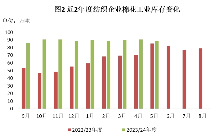 由于原料庫存處于相對高位以及下游未見起色,紡織企業(yè)信心不足,原料采購總體較為謹慎,實際成交不多,庫存穩(wěn)中有降。截至5月31日,紡織企業(yè)在庫棉花工業(yè)庫存量為88.6萬噸,環(huán)比減少2萬噸,同比增加3.2萬噸。其中:41%的企業(yè)減少棉花庫存,32%增加庫存,27%基本保持不變。
