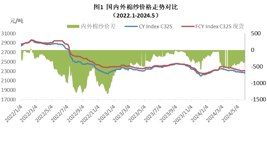 5月,內(nèi)外棉紗價格均下跌,國產(chǎn)32支純棉紗5月均價為22762元/噸,環(huán)比下跌了309元,跌幅1.3%,同比下跌了659元,跌幅2.8%;進口32支純棉紗5月均價23145元/噸,環(huán)比下跌了396元,跌幅1.7%,同比下跌了631元,跌幅2.7%。