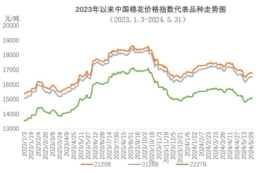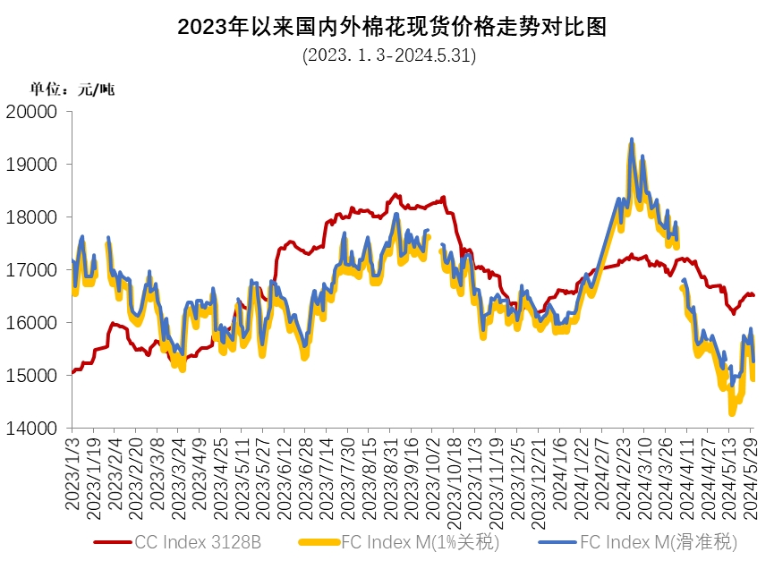 5月,國內(nèi)棉花市場供應(yīng)仍相對寬松,紡織市場進(jìn)入傳統(tǒng)淡季,下游訂單稀少,需求逐漸轉(zhuǎn)弱,紗線價(jià)格下跌庫存增加。前半月中國棉花價(jià)格指數(shù)承壓下行至本年度以來新低,后半月受宏觀經(jīng)濟(jì)數(shù)據(jù)延續(xù)回升向好態(tài)勢,棉價(jià)有所回升。紡織企業(yè)在棉價(jià)下行之際適量補(bǔ)庫,棉價(jià)上漲后補(bǔ)庫趨于謹(jǐn)慎。同期,受USDA月報(bào)上調(diào)全球和美棉產(chǎn)量、美聯(lián)儲(chǔ)降息預(yù)期推遲等因素影響,國際棉價(jià)下跌,跌幅大于國內(nèi),內(nèi)外棉現(xiàn)貨價(jià)差進(jìn)一步擴(kuò)大。
