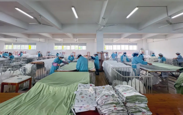 走進蘇州太湖雪絲綢股份有限公司的蠶絲被生產(chǎn)間內(nèi),處處可見熱火朝天的生產(chǎn)景象。工人們分工明確,正熟練地對一批夏季蠶絲被進行拉綿、縫制,再送至一旁的全自動機器絎縫定位。