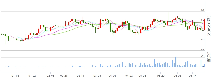 今日(2024年06月26日,周三)中國(guó)繭絲綢交易市場(chǎng)生絲電子指數(shù)上漲1.87%報(bào)于4961.10點(diǎn)。B絲(商檢4A級(jí)生絲):240725合約上漲0.96萬(wàn)元報(bào)收于49.62萬(wàn)元;240925合約上漲1.20萬(wàn)元報(bào)收于49.74萬(wàn)元;250325合約上漲1.20萬(wàn)元報(bào)收于50.28萬(wàn)元。