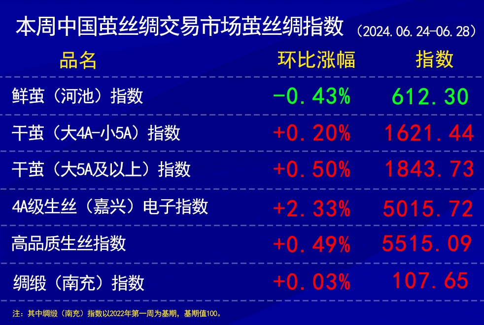 今日(2024年06月28日,周五)中國(guó)繭絲綢交易市場(chǎng)生絲電子指數(shù)上漲0.21%報(bào)于5015.72點(diǎn),本周生絲指數(shù)上漲2.33%。B絲(商檢4A級(jí)生絲):240725合約上漲0.09萬(wàn)元報(bào)收于50.25萬(wàn)元;240925合約上漲0.18萬(wàn)元報(bào)收于50.37萬(wàn)元;250325合約上漲0.03萬(wàn)元報(bào)收于50.94萬(wàn)元。