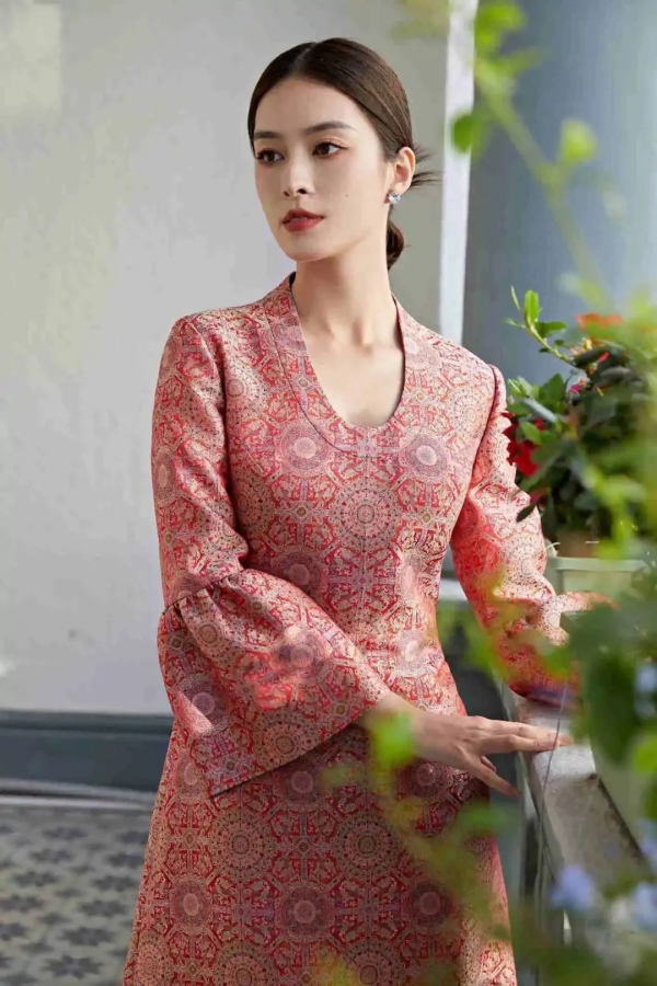 實際上,真正的新中式服裝的面料在紋理、印花、顏色等方面非常有講究。宋錦用5A級以上的蠶絲和“活色”技藝,將上萬根絲線在高達3.5米的提花木機上,經(jīng)過20多道工序織就而成,一天只能織幾厘米。這也使宋錦價格高昂。如八達暈夔龍紋的面料純手工織布每米就要1580元。