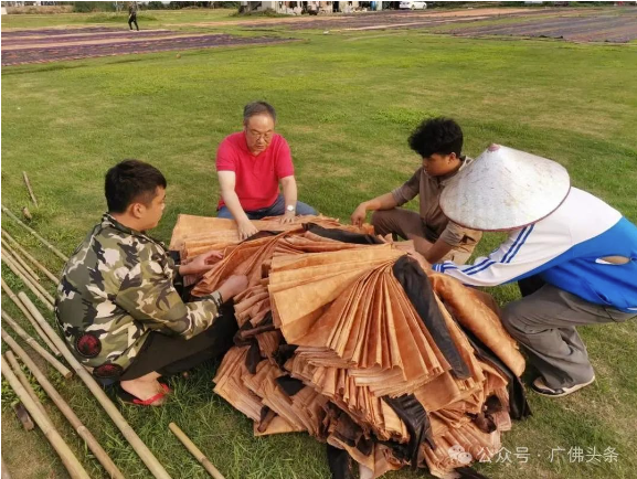 據(jù)介紹,香云紗制作需涉及到13項(xiàng)純手工操作,以“曬莨”一環(huán)最為關(guān)鍵,也最為辛苦。在環(huán)節(jié)中,把過了薯莨汁的香云紗運(yùn)到曬莨場(chǎng),然后把香云紗平鋪在草地上,還要用竹竿把布料壓住,防止被風(fēng)刮走。經(jīng)過晾曬之后,工人要把布料收回去,等待第二天再過薯莨汁,如此重復(fù)幾十次,一般前后需要?dú)v經(jīng)2-3個(gè)月。但如果降雨頻繁天氣,時(shí)間要更長(zhǎng)。