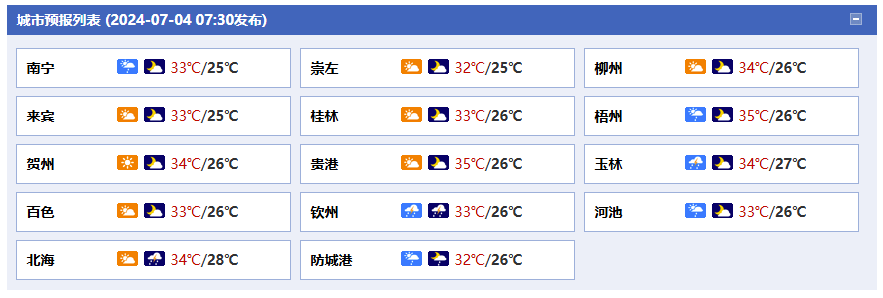 南寧市:今天白天多云有陣雨或雷雨,今天晚上多云,偏南風(fēng)2級(jí),最高氣溫33℃,最低氣溫25℃。