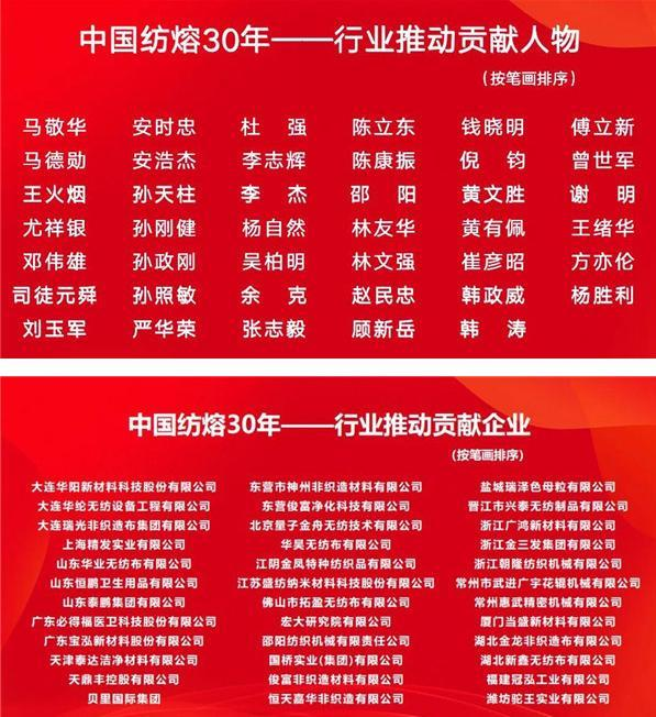 紡粘分會成立30年,也是中國紡絲成網(wǎng)行業(yè)砥礪前行的30年。行業(yè)的蓬勃發(fā)展,得益于眾多企業(yè)家日復(fù)一日的耕耘與創(chuàng)新。在紡粘分會成立三十周年之際。分會發(fā)布了“中國紡熔30年——行業(yè)推動貢獻(xiàn)企業(yè)與個人”榮譽(yù)榜單。向所有為行業(yè)發(fā)展做出卓越貢獻(xiàn)的企業(yè)及個人致以崇高的敬意。