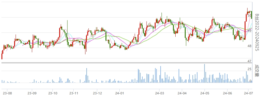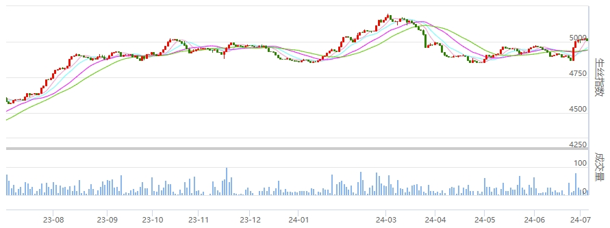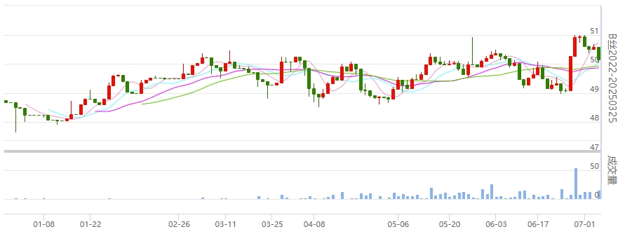 今日(2024年07月04日,周四)中國繭絲綢交易市場生絲電子指數(shù)下跌0.24%報5010.99點。B絲2022D(商檢4A級生絲):240725合約下跌0.06萬元報收于50.22萬元;240925合約下跌0.48萬元報收于49.92萬元;250325合約下跌0.42萬元報收于50.16萬元。B絲40/44-240725合約報平收48.42萬元;A絲20/22-240725合約上漲0.03萬元報51.75萬元。(更多行情詳情到首頁進(jìn)行查看)