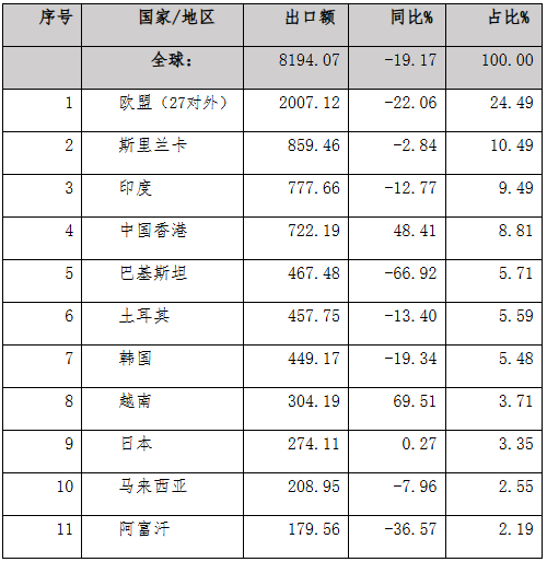 在主要市場中,對越南出口占比最大,為29%,增幅4.46%,對中國臺灣地區(qū)和孟加拉出口大幅增長,增幅分別為87.17%和40.31%(詳見表8)。
