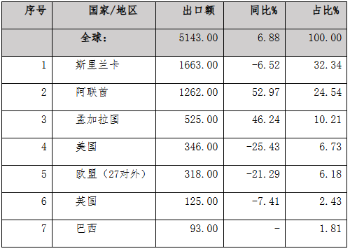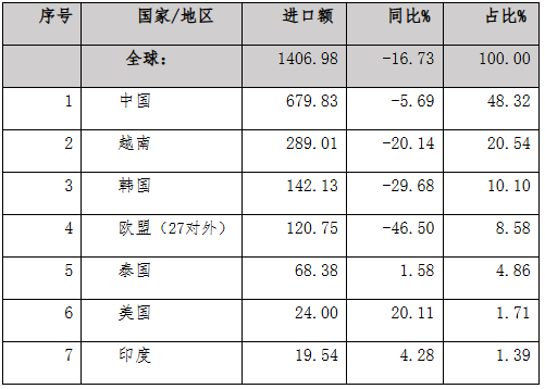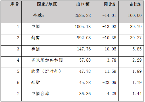 對前三大市場中國、越南、泰國出口額均下降,降幅均超過了10%。由于對中、越、泰出口額合計占比在80%以上,雖對多米尼加和歐盟出口有所增長,但基數(shù)小,占比低,難以扭轉(zhuǎn)整個出口下降的局面(詳見表7)。