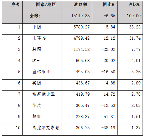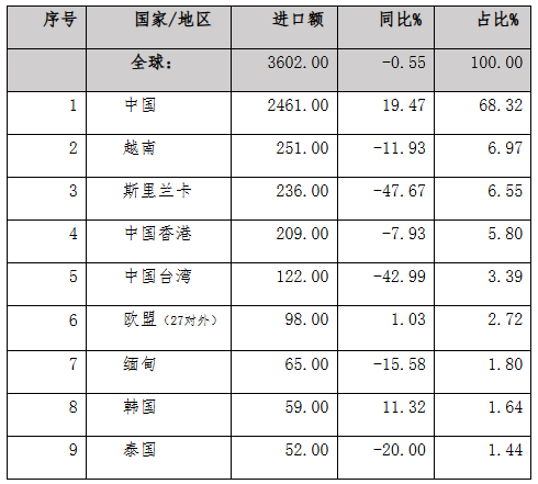 在主要來源地中,自中國進口占比為68%,進口額增長了19.47%。自其他國家(地區(qū))進口額仍很?。ㄔ斠姳?1)。