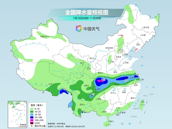 明天開始,雨帶將隨著副熱帶高壓南北擺動。預計明天至13日,雨帶西段維持在四川盆地、西北地區(qū)東南部,雨帶東段南壓至江淮一帶。