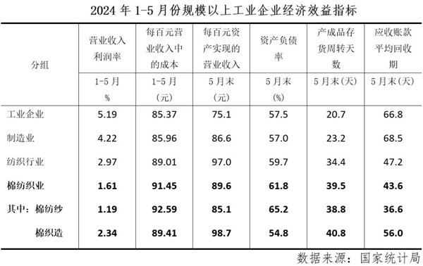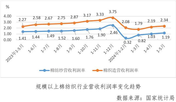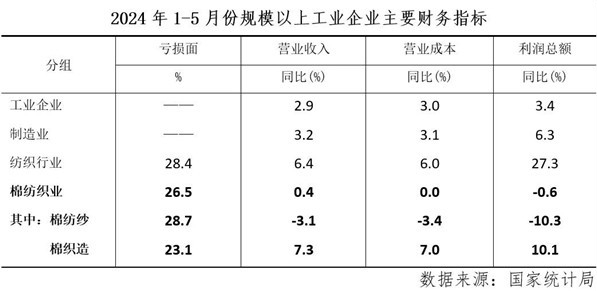 1-5月份數(shù)據(jù)顯示,規(guī)上棉紡織業(yè)雖然營收和利潤增速較1-4月份繼續(xù)放緩,但虧損面在降低,利潤率也有所回升,主要經(jīng)濟指標漲跌互現(xiàn),效益指標局部改善。
