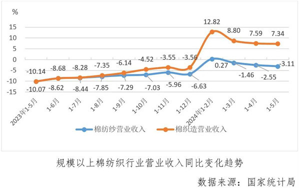 據(jù)國家統(tǒng)計局數(shù)據(jù),1-5月份,規(guī)上棉紡紗營業(yè)收入同比下降3.11%,降幅比1-4月份擴大0.56個百分點,規(guī)上棉織造營業(yè)收入同比增加7.34%,增速比1-4月份放緩0.25個百分點。1-5月份,棉紡紗和棉織造營業(yè)收入指標繼續(xù)受阻,且棉紡紗營收累計增速已連續(xù)三個月為負值。
