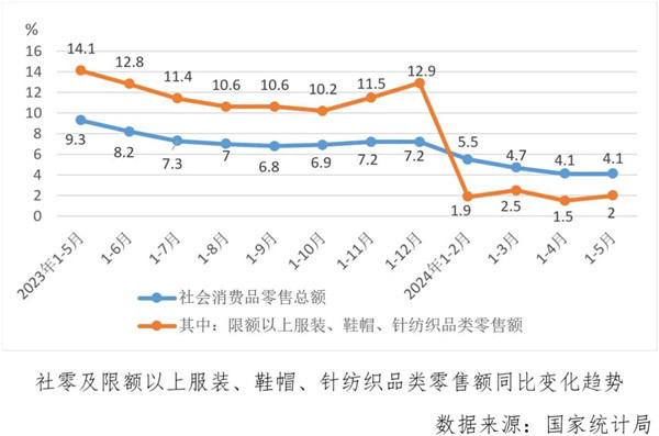 5月份,社會消費品零售總額39211億元,同比增長3.7%,1-5月份,社會消費品零售總額195237億元,同比增長4.1%。其中限額以上服裝、鞋帽、針紡織品類5月份和1-5月份累計同比分別上漲4.4%和2%。